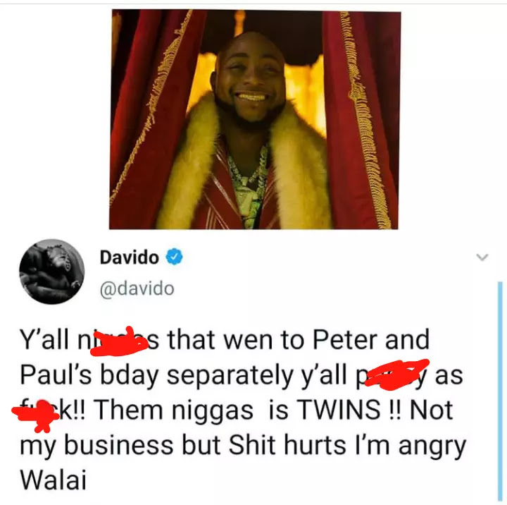 One of the twin brothers of the Okoye Peter has replied Davido for his statement which he directed to the people that went to their birthday parties separately.