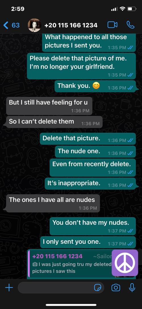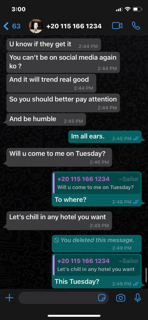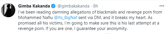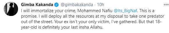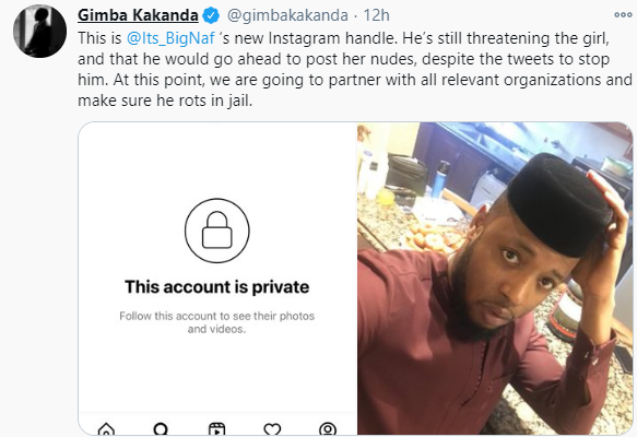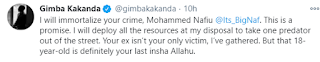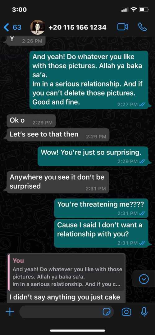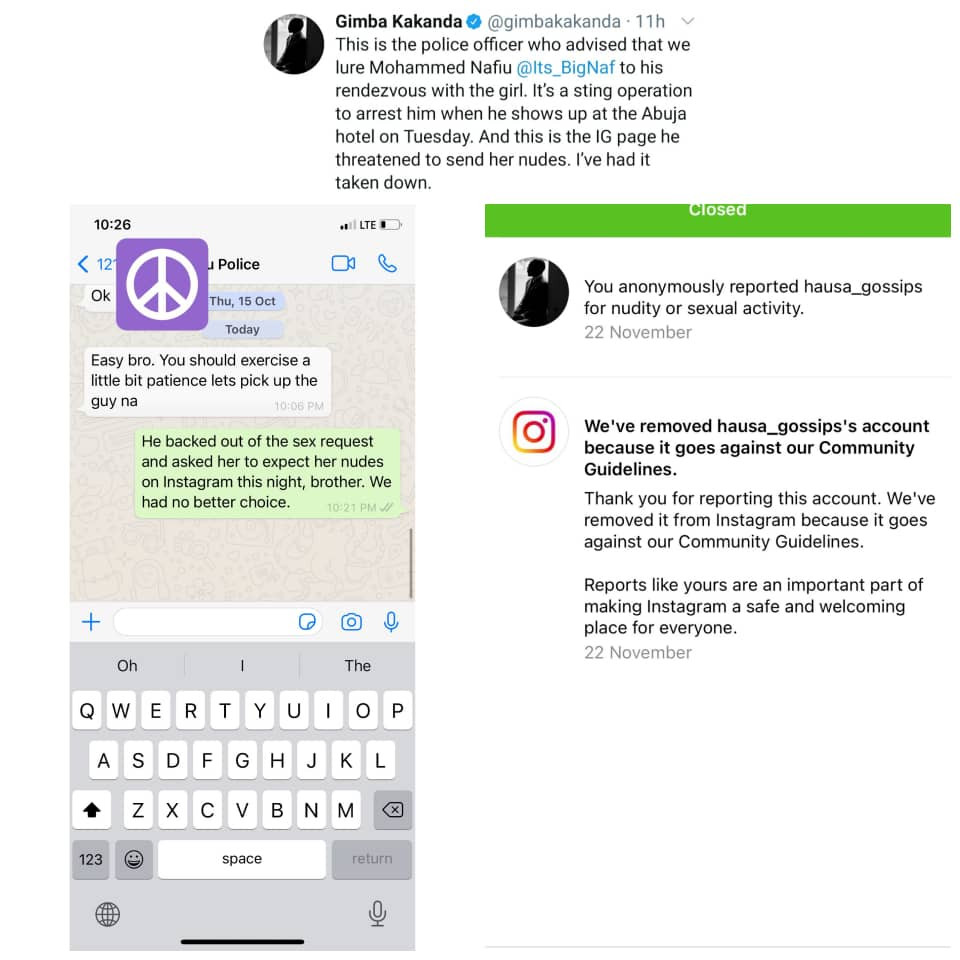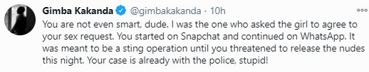 In a Twitter thread, Gimba shared screenshots of Nafiu’s alleged chats with the eighteen-year-old girl in which he threatened to release her nudes if she doesn’t come chill with him in any hotel of her choice.