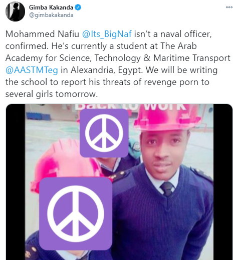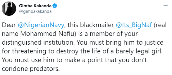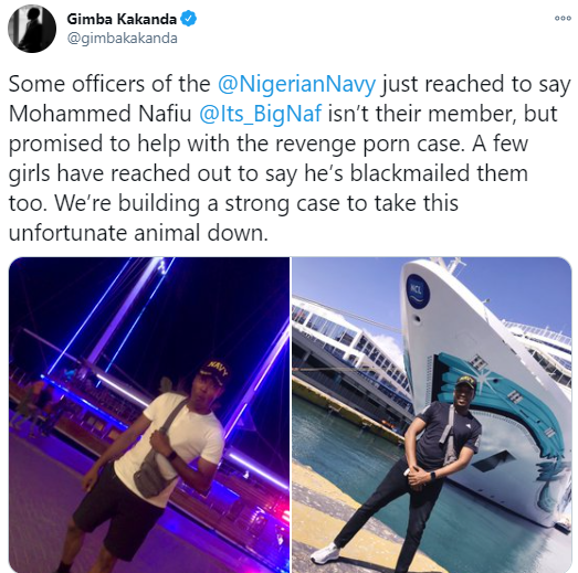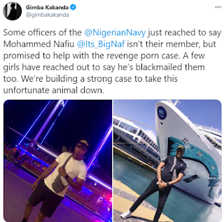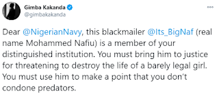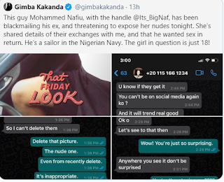 Journalist, Gimba Kakanda, has called out a Nigerian sailor, Mohammed Nafiu, pictured above, for allegedly threatening to release the nudes of an 18-year-old girl after she refused to continue having sex with him.