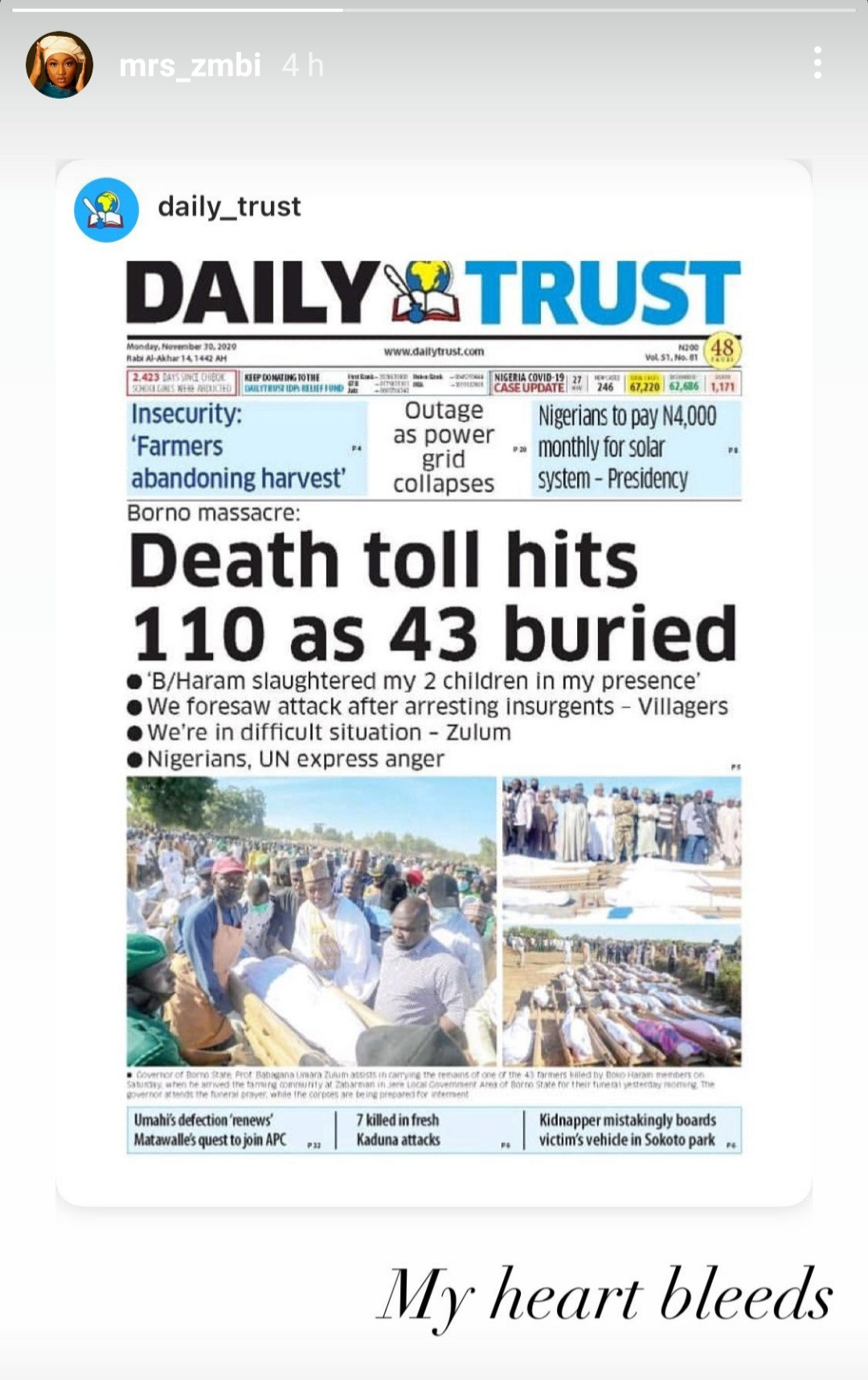 The daughter of the president of Nigeria shared a newspaper shot of the Zabarmari massacre and wrote: “My heart bleeds”.