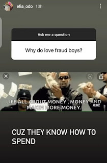 In response, Efia said she loves yahoo boys because they know how to spend. See her response below;