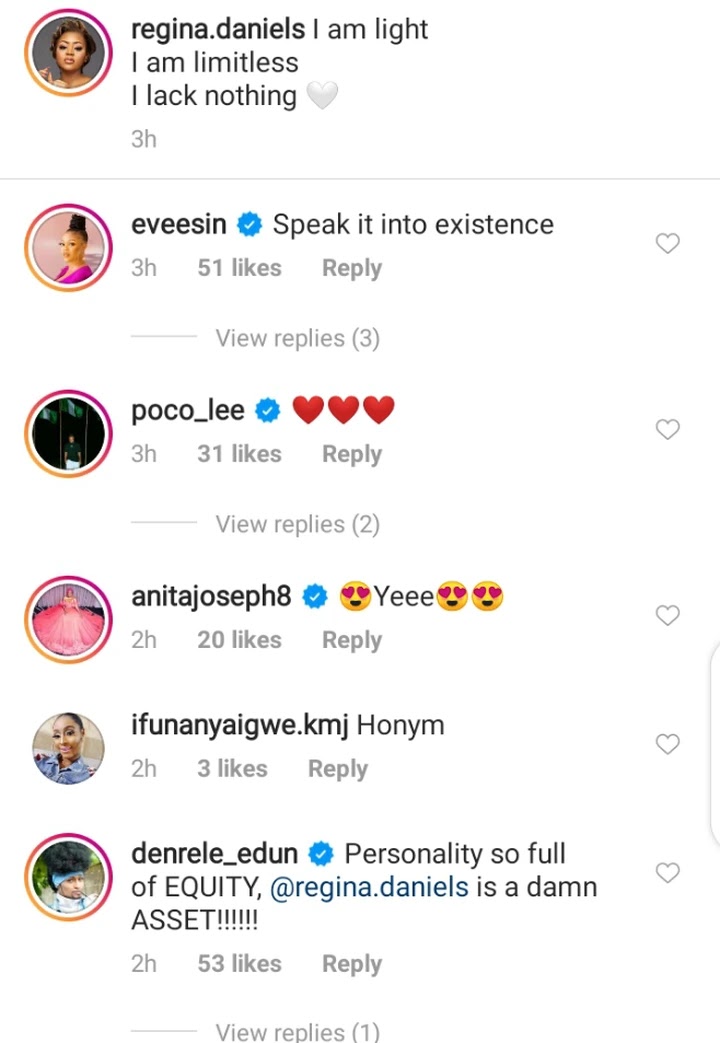 “Personality so full of equity. Regina Daniels is a damn asset,” veteran entertainer, TV personality and actor, Denrele Edun wrote in reaction.