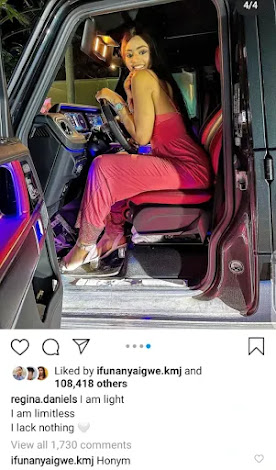 Beautiful actress and billionaire wife, Regina Daniels is letting everyone know that she doesn’t lack anything in this world, and she’s not apologetic about her feelings or words. She also made it clear that she is light which is limitless, hence the reason she doesn’t lack anything.