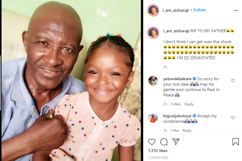 Nollywood actress, Aishat Raji has lost her father to the cold hands of death.