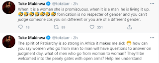 fornication is no respecter of gender and you can’t judge someone cos you sin different or you are of a different gender.”she tweeted