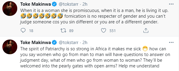 She ended her tweet by pointing out that fornication is not a one-gender thing and that people cannot judge others because they sin differently.