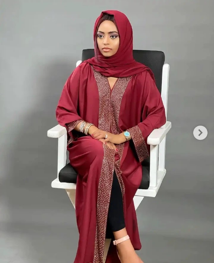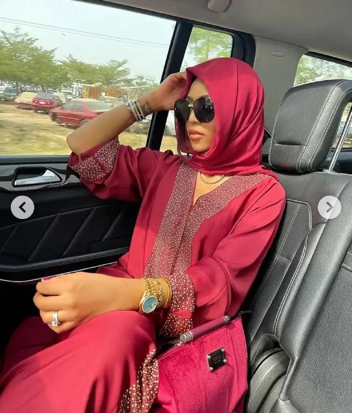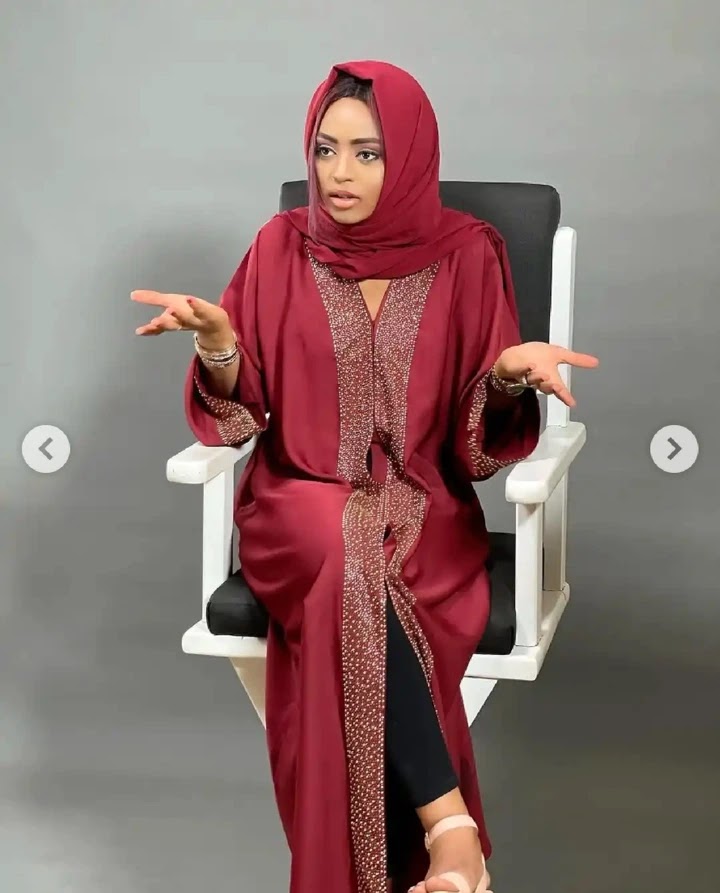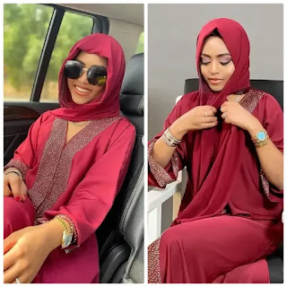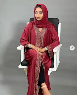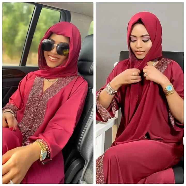 The beautiful mother of one, shared the photos of herself wearing a wine colour flowing gown and a hijab and wrote;
