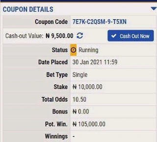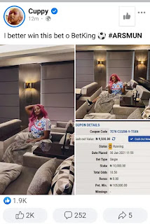 She was to win N105,000, if Manchester United beat rivals, Arsenal; and loose N10,000 if Arsenal win or draw – a loss which may count as nothing to the singers financial status.
