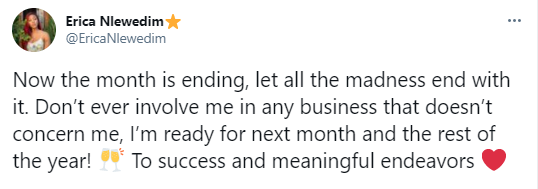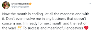 ”Now the month is ending, let all the madness end with it. Don’t ever involve me in any business that doesn’t concern me, I’m ready for next month and the rest of the year! To success and meaningful endeavors”