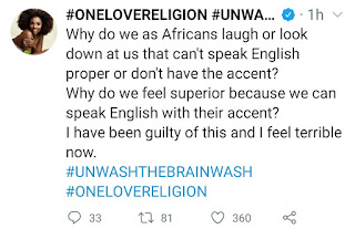 He tweeted: “Why do we as Africans laugh or look down at us that can’t speak English proper or don’t have the accent?