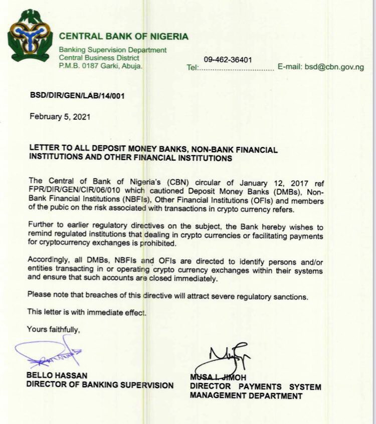 Accordingly, all DMBs, NBFIs and OFIs are directed to identify persons and/or entities transacting in or operating cryptocurrency exchanges within their systems and ensure that such accounts are closed immediately.”
