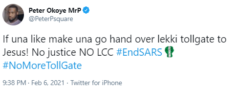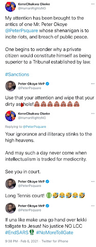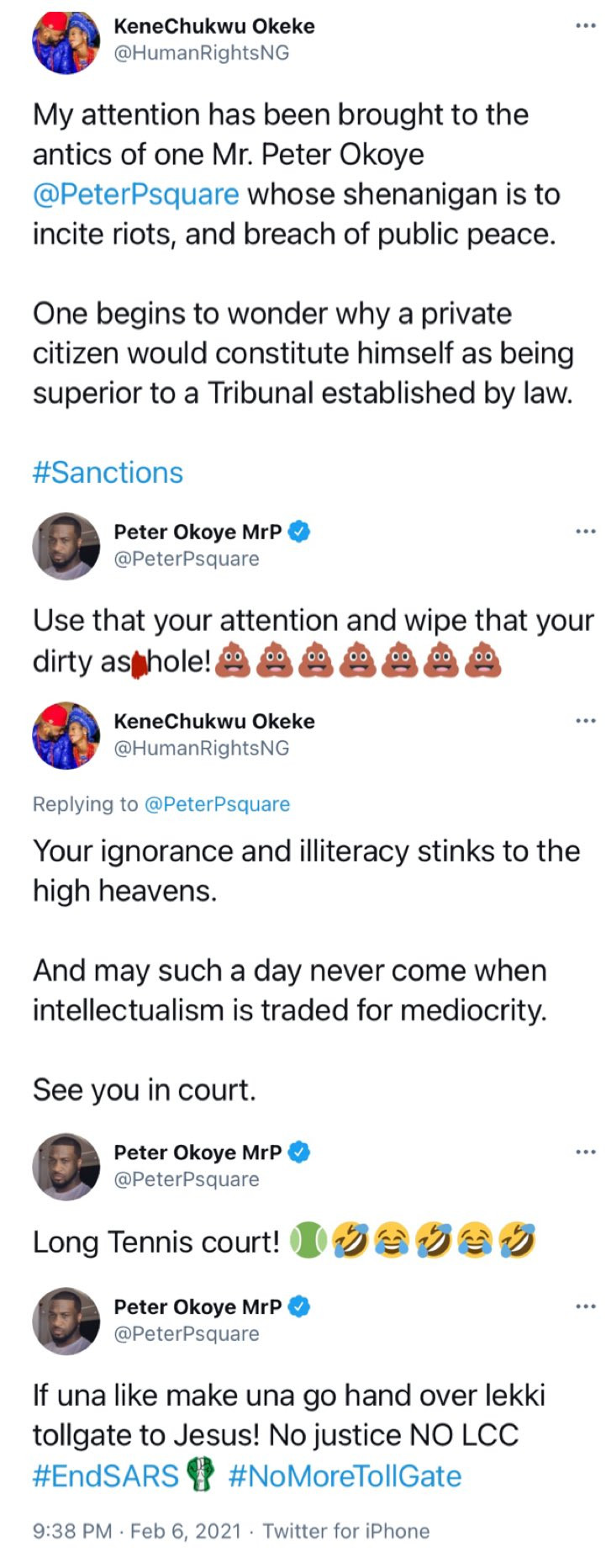 Singer Peter Okoye and human rights activist, Kenechukwu Okeke, clashed on Twitter today February 7, over the reopening of the Lekki toll gate.