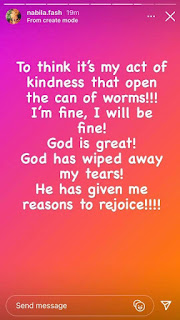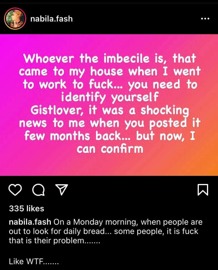 Nabila in posts shared on her Instastories, revealed that an “imbecile” came to her matrimonial home to sleep with her husband while she was at work.
