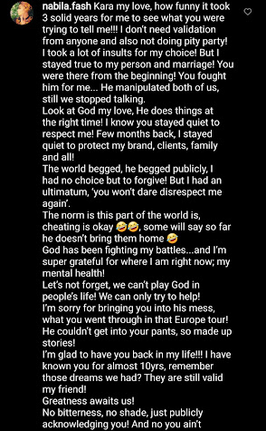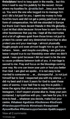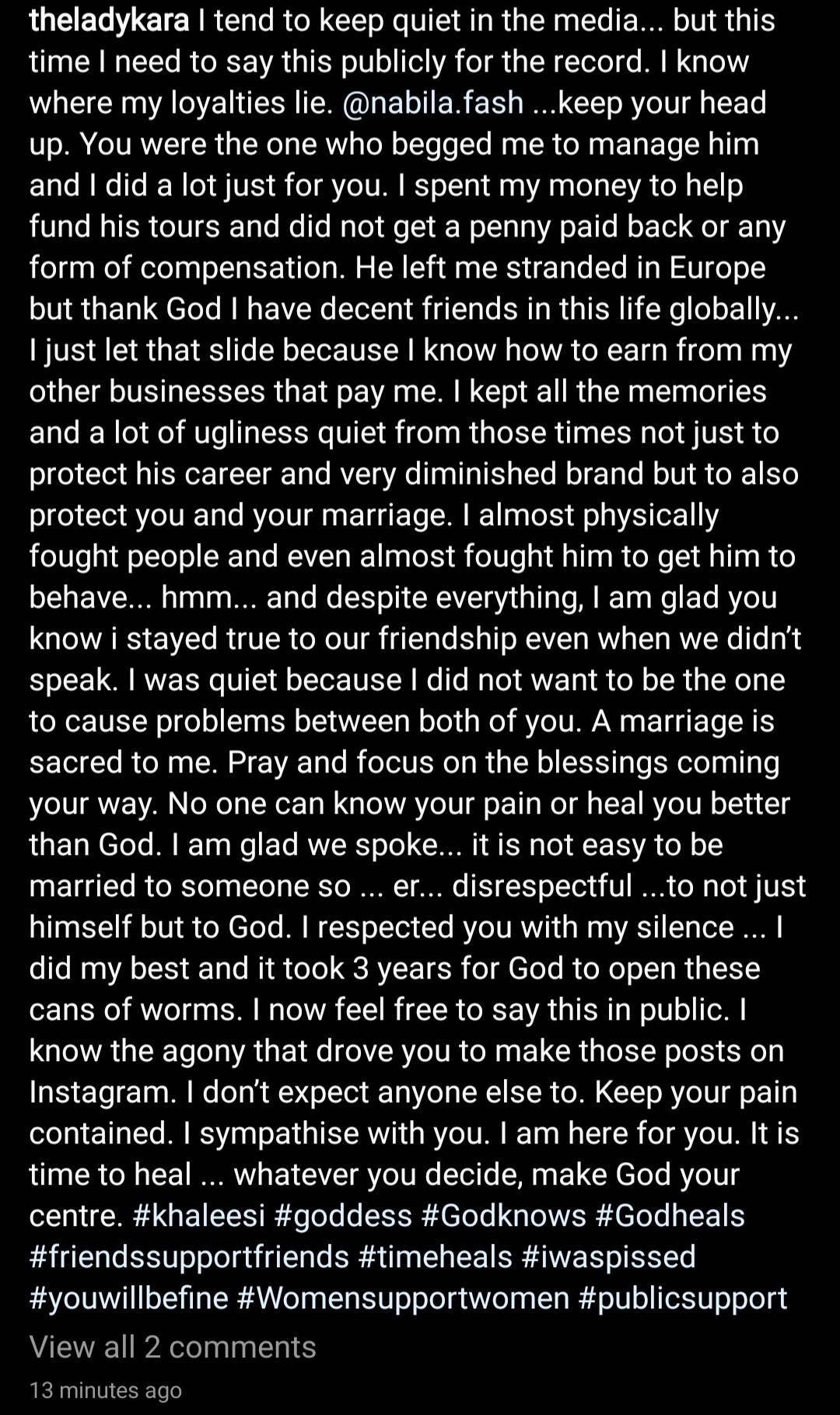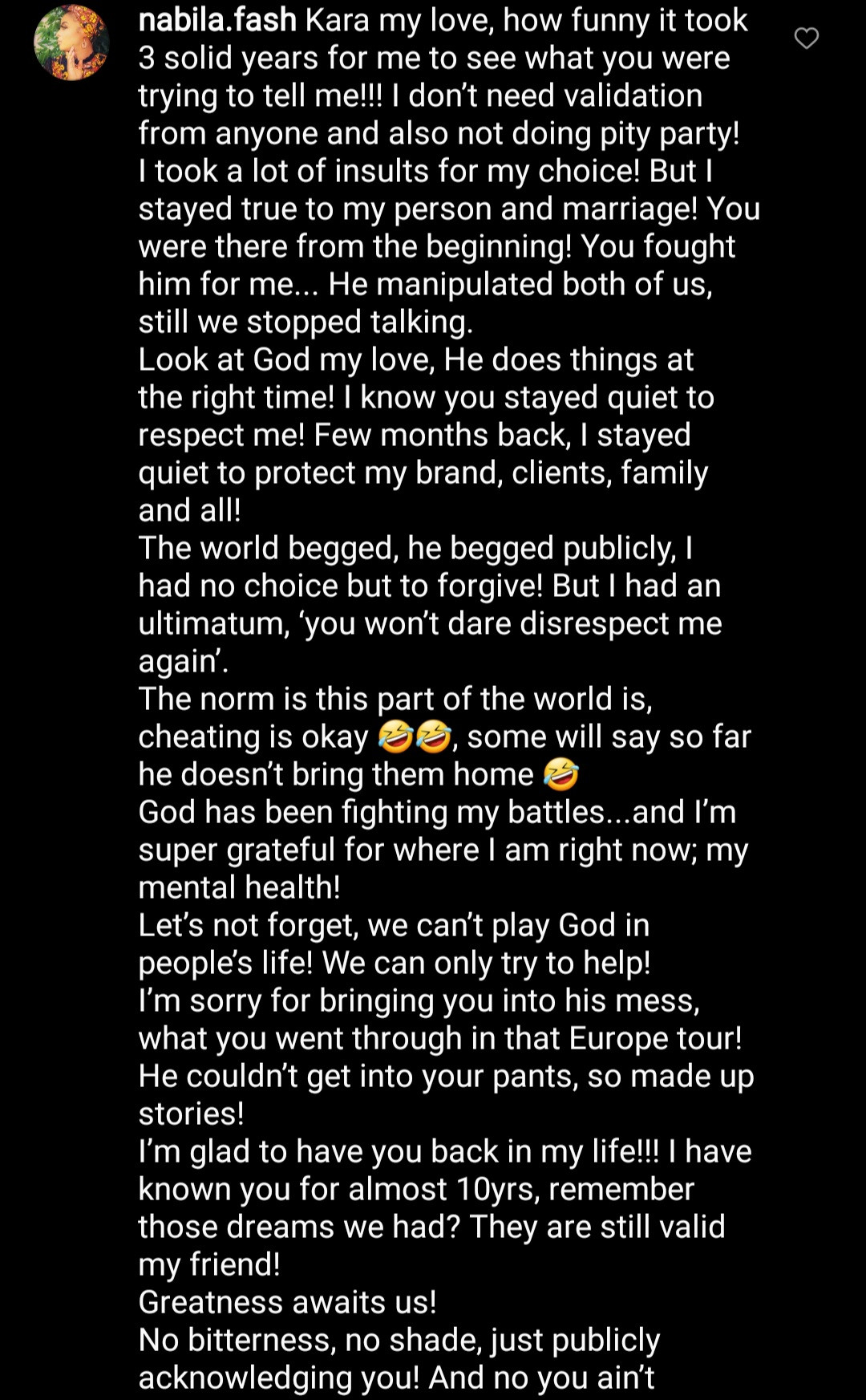 She wrote: “I tend to keep quiet in the media… but this time I need to say this publicly for the record. I know where my loyalties lie. @nabila.fash …keep your head up.