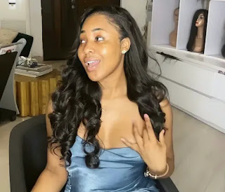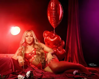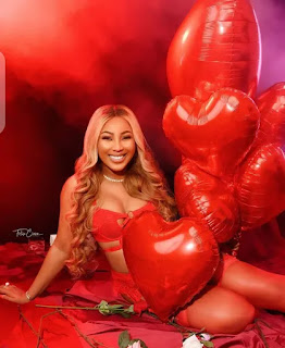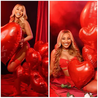 In the new pictures Erica shared on Instagram, she was all smiles, as she wore a red outfit, a blonde curly wig, and put her curves on display. The environment where Erica took the pictures, was decorated with red balloons and flowers, which is a symbol of Valentines Day.
