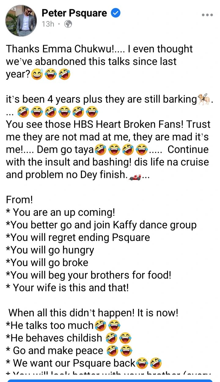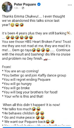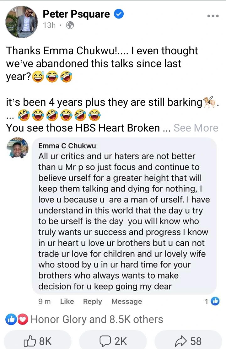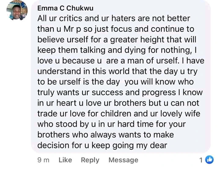 Emma Chukwu one of the fans of Mr. P has revealed who Mr. P is now and what fans should do. He made it known that people that are criticizing and hating Mr. P are not even better than him, he revealed that Mr. P is a man of himself, he also revealed that is only when you began doing things yourself that you will know who wants your success and failure.