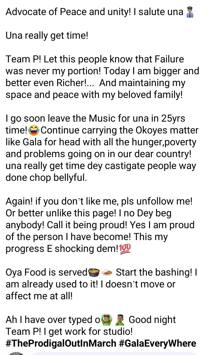 At some point, people decide to go solo and everyone should respect that decision and follow the trend. Mr. P already has disclosed that anyone that doesn’t love him should unfollow him or better still block him.
