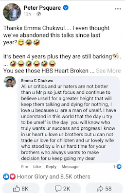 Mr. P of the former Psquare crew has thanked a fan who stood by him and revealed the man he has become and shade all the Criticism that is coming to him. Remember Nigerians and many people who are fans of Psquare each day remaining Mr. P that is high time for Psquare crew to come back alive again, asking him to reconcile with his brother and let peace reign.