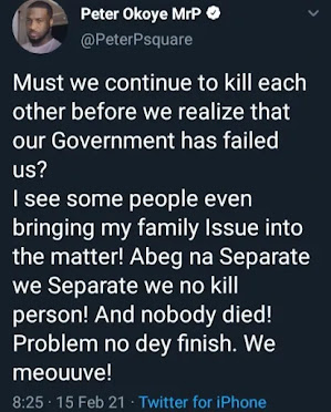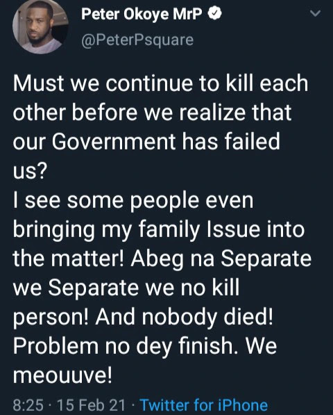 In his words, “Must we continue to kill each other before we realize that our government has failed us. I see some people even bringing my family issue into this matter! Abeg na separate we separate we no kill person! And nobody died!”
