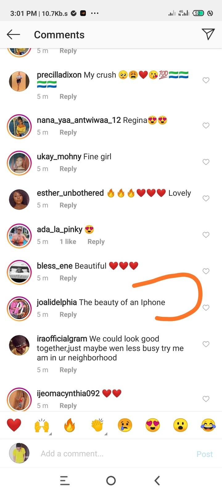 While reacting to this, a fan who seems less bothered about the luxuries noticed something that others do not. While reacting to the pictures, @jaolidelphia said, “the beauty of an iPhone”, which simply illustrate that, Regina Daniels might not be that beauty as seen behind the cameras.