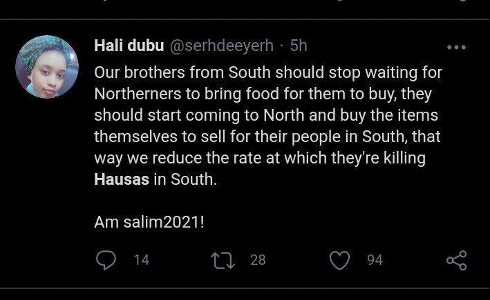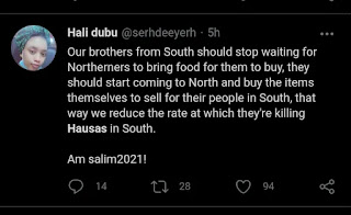 However, a Fulani lady identified as Hali Dubu shared a very important message to the Southerners who are complaining of food scarcity and blockage of farm products to their region. According to Hali, she told Southerners to stop waiting for people from the North to bring food for them, she added that they should come over to the North immediately and buy for themselves. This will stop the shedding of blood and killing of Hausa/fulani people in the South.