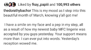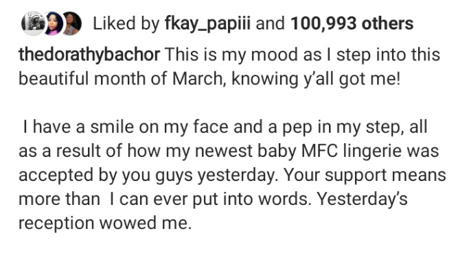In the viral post, Dorathy said; “This is my mood as I step into this beautiful month of March, Knowing you all got me”.