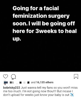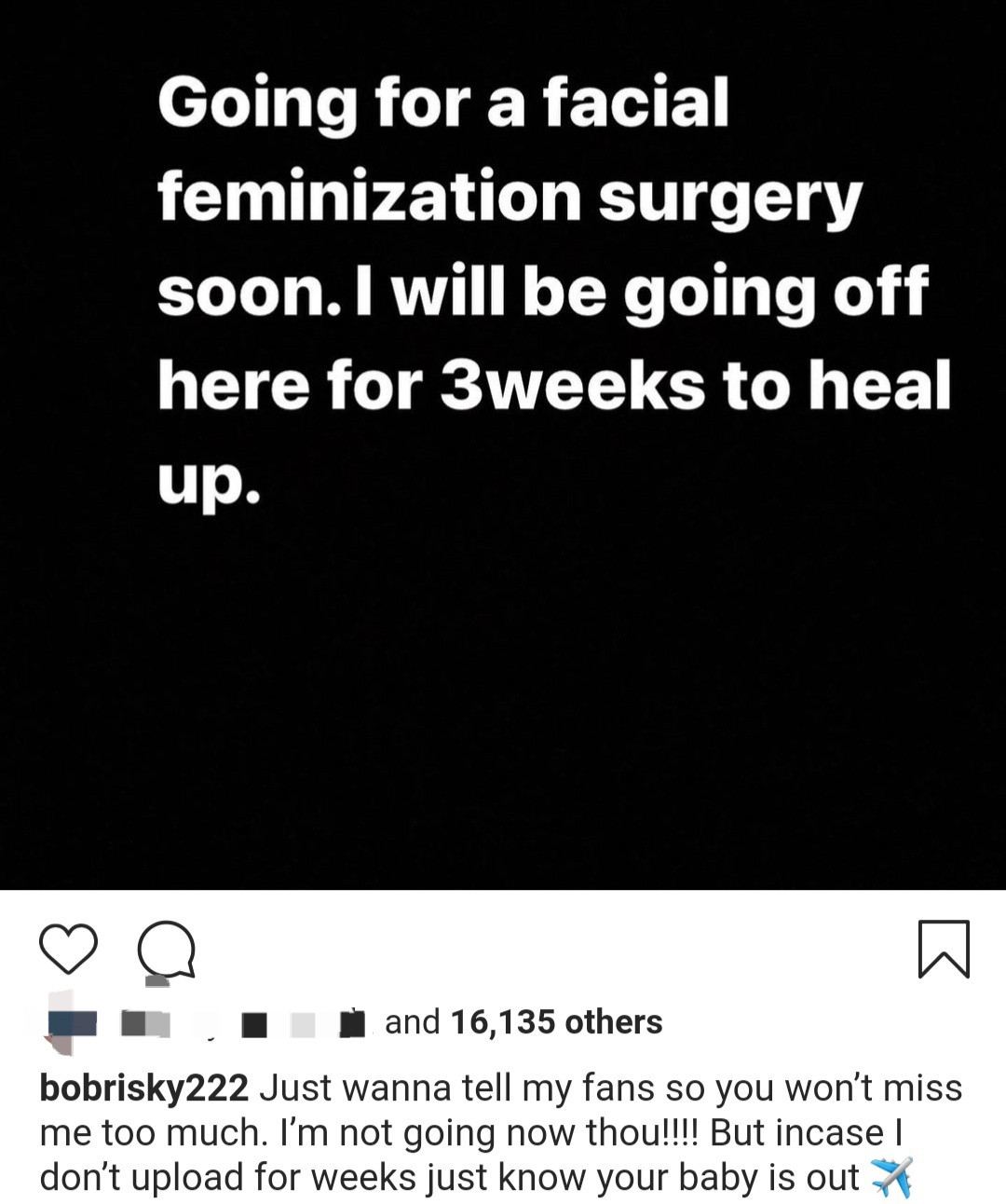 The crossdresser said he’ll be away from Instagram for some weeks to heal from his “facial feminization surgery “.