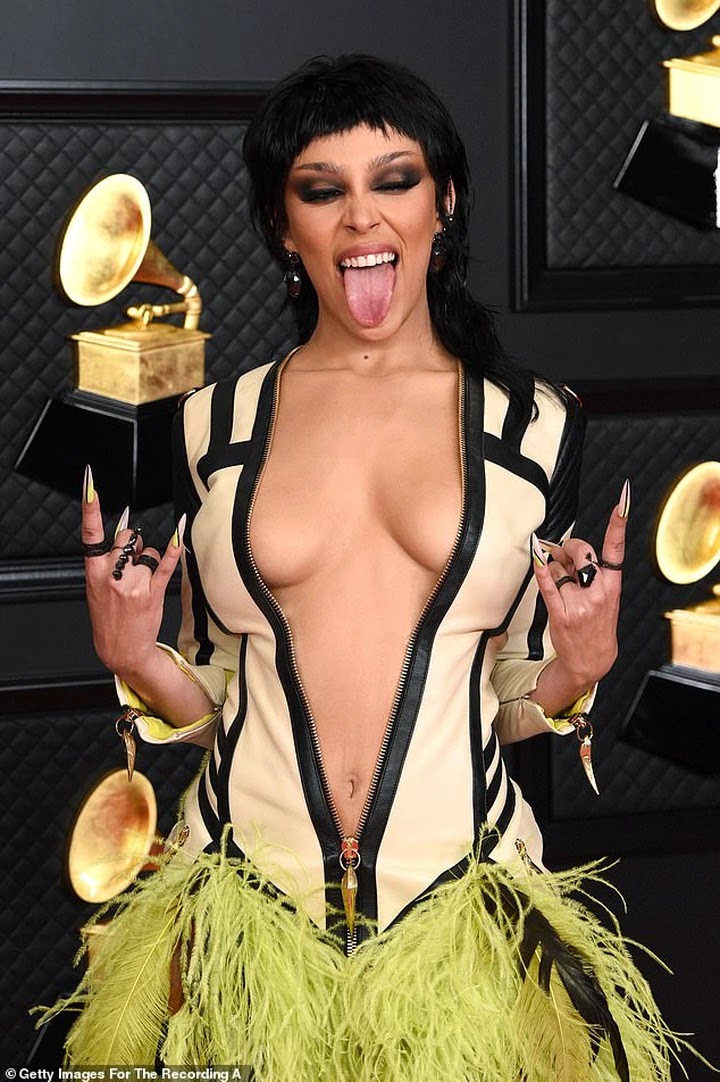 Doja Cat wore a bold and attention-getting look on Sunday, when she strutted the Grammy Awards red carpet in a super-revealing Roberto Cavalli gown at the LA Convention Center in Los Angeles, California.