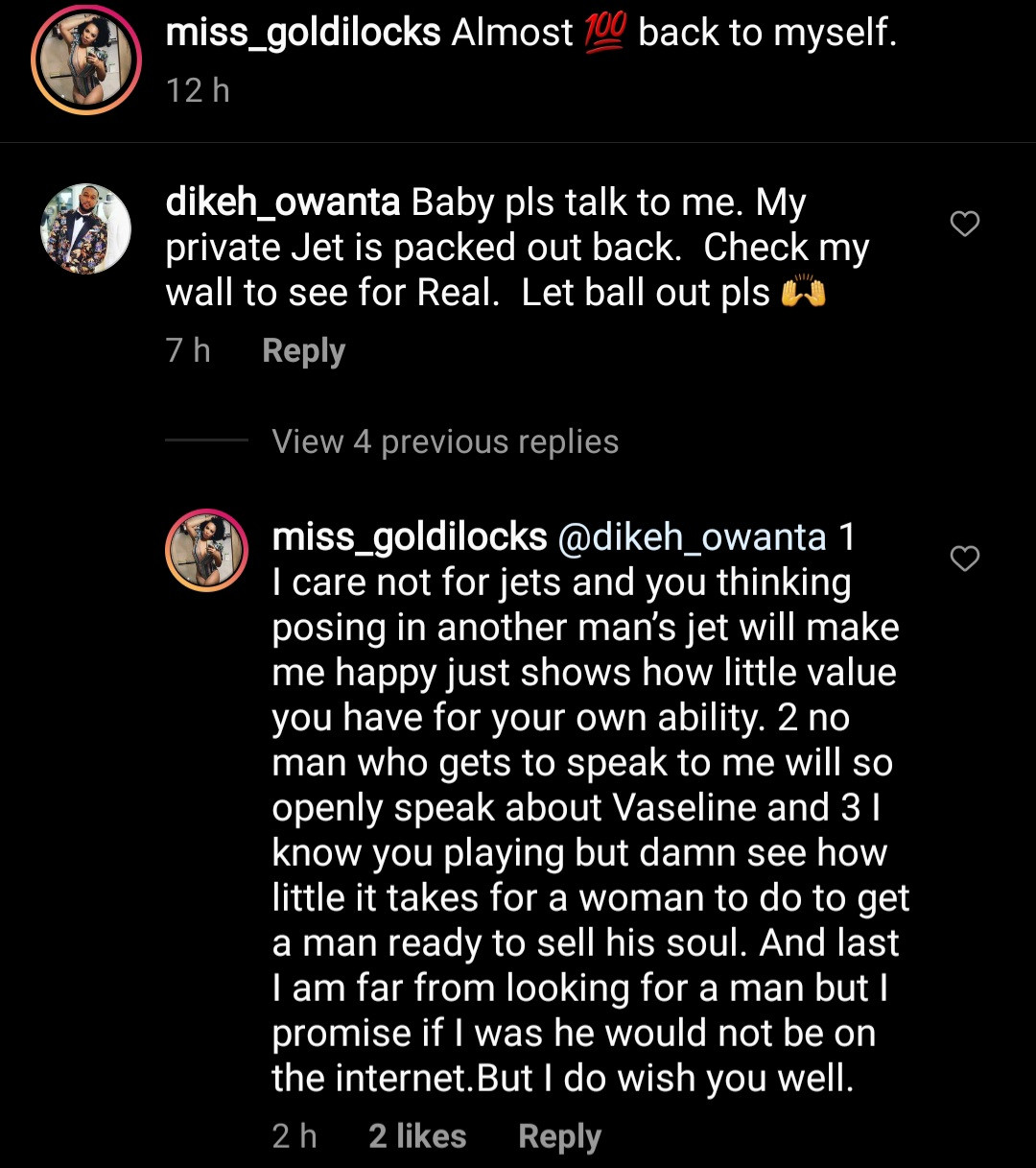 A follower replied, indicating interest in her while letting her know that he has a private jet.