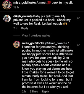 Wendy hit back, telling him that she’s not looking for a man and even if she were, he wouldn’t be on the Internet. She also told him she doesn’t care for jets and him boasting with a jet shows how little value he places on himself.