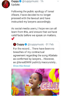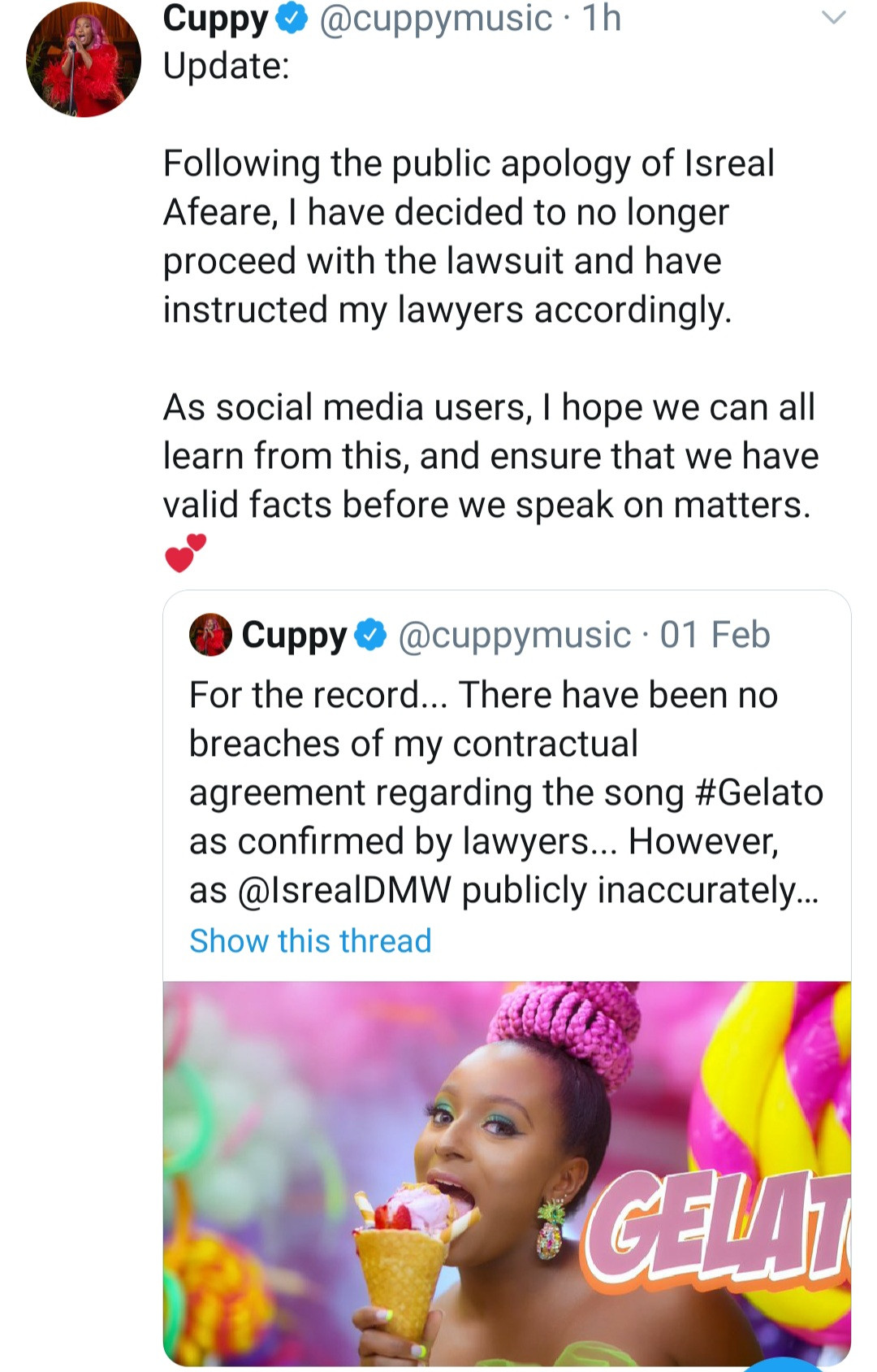 DJ Cuppy has taken to Twitter to update her followers after threatening to sue Israel Afeare for defamation.