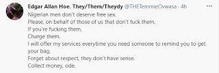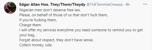 ”Nigerian men don’t deserve free sex. Please, on behalf of those of us that don’t fuck them, If you’re fucking them, Charge them. I will offer my services everytime you need someone to remind you to get your bag, Forget about respect, they don’t have sense. Collect money, ode.”
