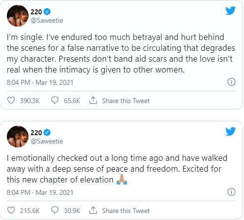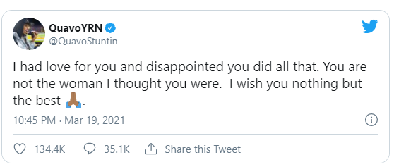 Following Saweetie’s announcement, Quavo shared his own tweets, saying that he had love for her but she isn’t the woman he thought she was.