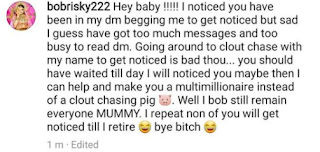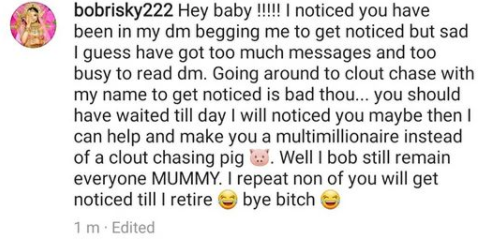 ”Hey baby !!!!! I noticed you have been in my dm begging me to get noticed but sad I guess have got too much messages and too busy to read dm. Going around to clout chase with my name to get noticed is bad thou… you should have waited till d day I will noticed you maybe then I can help u and make you a multimillionaire instead of a clout chasing like a shemale pig . Well I bob still remain everyone MUMMY. I repeat non of you will get noticed till I retire bye bitch