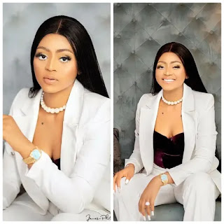 Nollywood light skinned beautiful actress, Regina Daniels trends online again as she shares adorable photos of herself wearing a white trouser suit as her fans react in admiration.