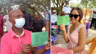 The couple took to their individual social media pages on Friday to share photos of themselves taking Oxford/AstraZeneca shot in Udumuje Ugboko area of Delta.
