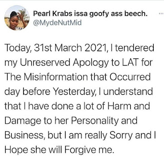 Today, 31st March 2021, I tendered my Unreserved Apology to LAT for The Misinformation that Occurred day before Yesterday, I understand that I have done a lot of Harm and Damage to her Personality and Business, but I am really Sorry and I Hope she will Forgive me. pic.twitter.com/Ze5iYNQknv