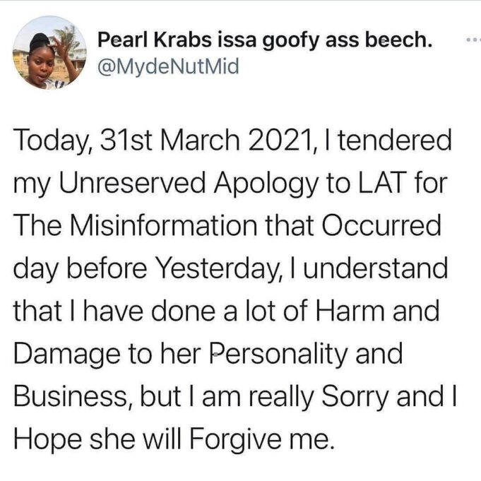 “Today, 31st March 2021, I tendered my Unreserved Apology to LAT for The Misinformation that Occurred day before Yesterday, I understand that I have done a lot of Harm and Damage to her Personality and Business, but I am really Sorry and I Hope she will Forgive me.