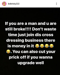 “If you are a man and you are still broke!!! Don’t waste time just join this cross-dressing business, there is money in it. You can also cut your prick off if you wanna upgrade well”