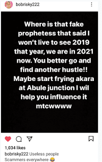 “Where is that fake prophetess that said I won’t live to see 2019 that year, we are in 2021 now. You better go and find another hustle!! Maybe start frying akara at Abule junction I wil help you influence it mtcwwww.”