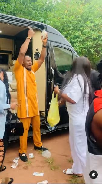 In the video, the actor who wasn’t aware of the stunt was blindfolded while being led to the spot of merriment. His wife could also be seen giving him a huge wad of cash while he launched a random spray in excitement.