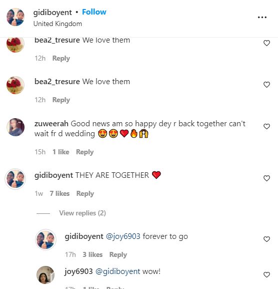Replying, Gidiboy noted that the pair have rekindled their love and are now back together.