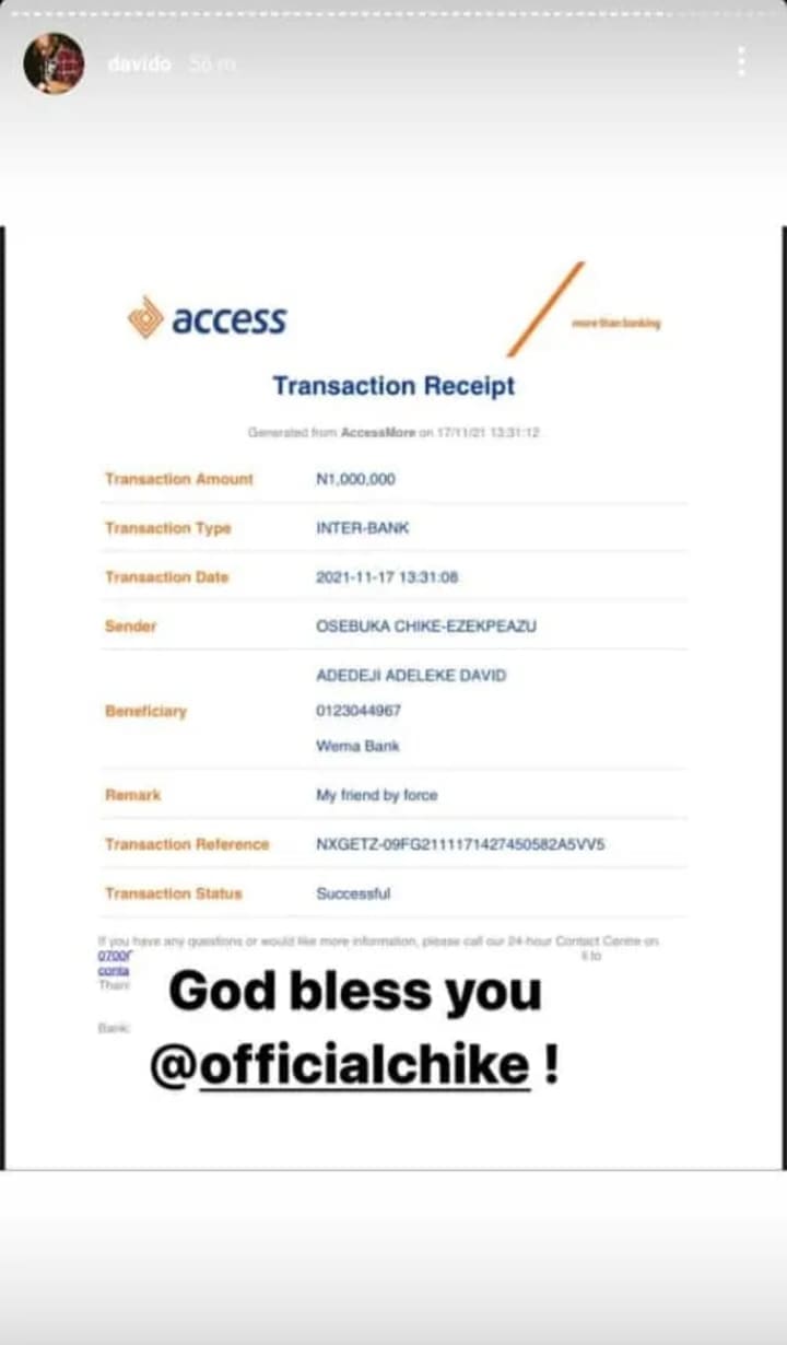 Chike sent the singer N1 million hard cash, which was surprising to a number of people because they had never seen Davido and Chike together. They didn’t even know if the two had ever met. As you can imagine, a number of people immediately begun thinking that Chike sent the money to chase clout or to join the bandwagon of senders, but now the singer is opening up about exactly what he actually sent that N1 million to Davido. Here is what Chike explains.