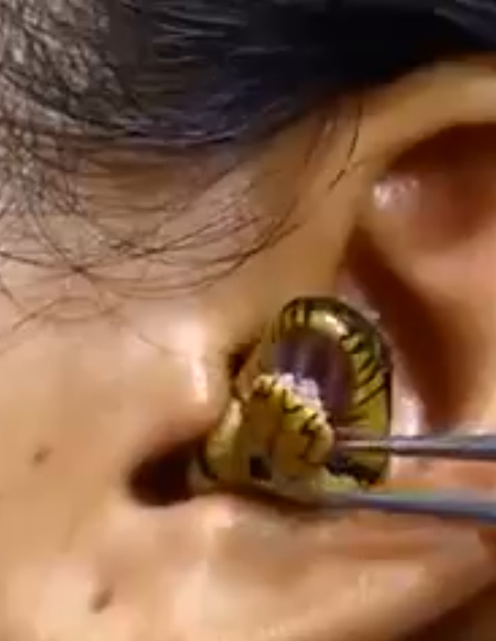 In the nearly four-minute clip, an alleged medical practitioner is seen using tweezers in a desperate attempt to extract a black and yellow snake from the female patient’s ear.