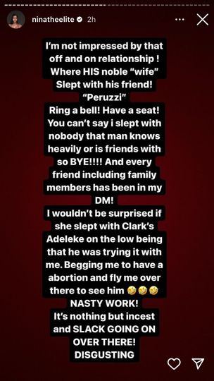 Responding to Peruzzi, the new baby mama to be has taken to her page on Instagram to drag Peruzzi. She accused Peruzzi of sleeping with Chioma. She further insinuated that Chioma might have also slept with Davido’s cousin Clark Adeleke because he has been pestering her to sleep with her as well.