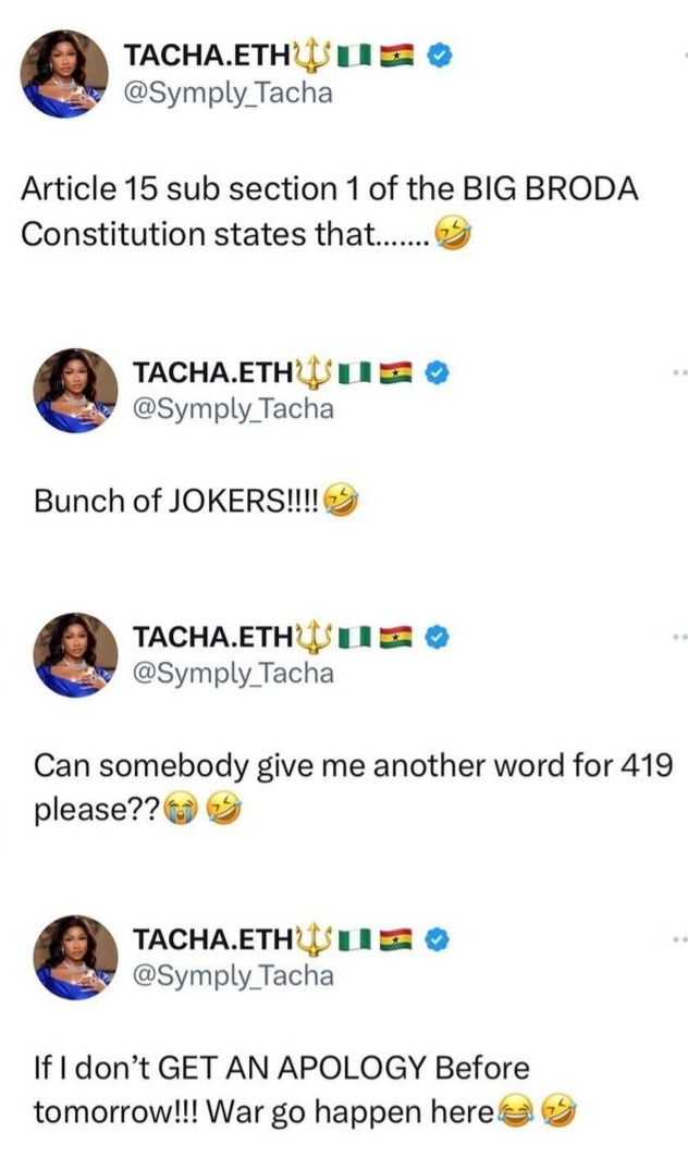 War will happen if I don’t get an apology before tomorrow – Tacha threatens as she accuses #BBNaija organisers of deceit “419”