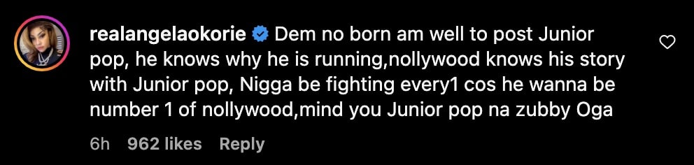 “Dem no born am well to post Junior pop, he knows why he is running, nollywood knows his story with Junior pop, Nigga be fighting every1 cos he wanna be number 1 of nollywood, mind you Junior pop na zubby Oga,” she wrote.